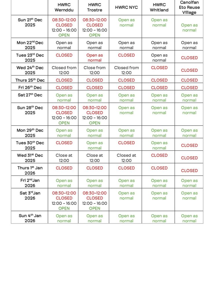 Ar gau drwy’r dydd ar Ddydd Nadolig, Dydd San Steffan a Dydd Calan