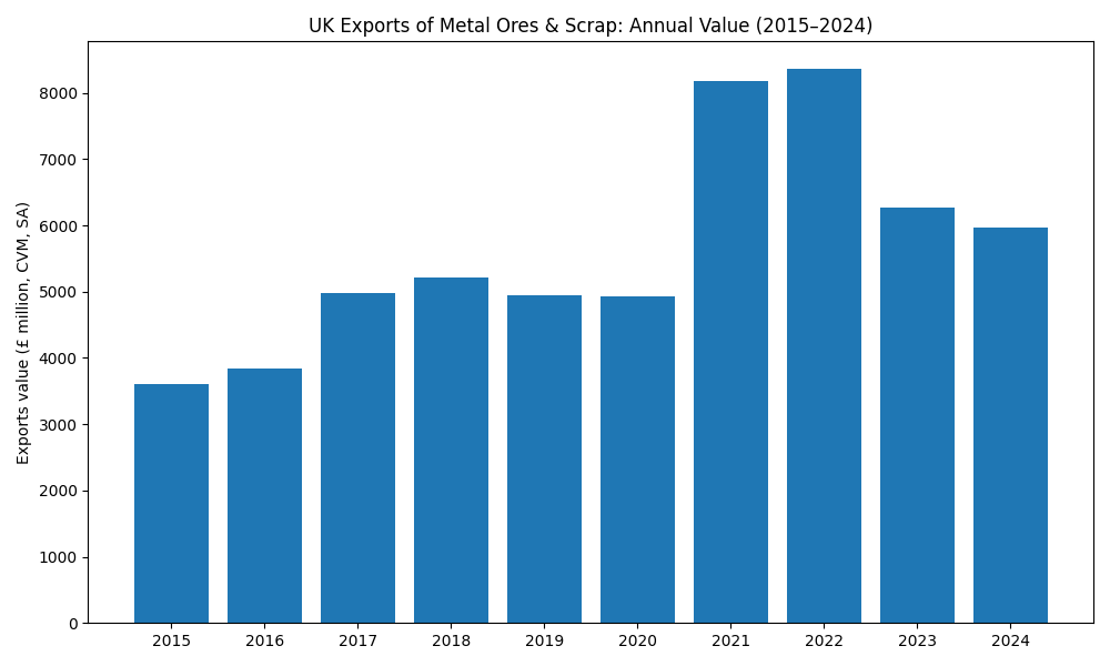 Source: Office for National Statistics (ONS), UK trade time series (MRET), Series ID OEEW “Trade in Goods: Metal ores & scrap (28): Exports” (annual data, CVM, seasonally adjusted)