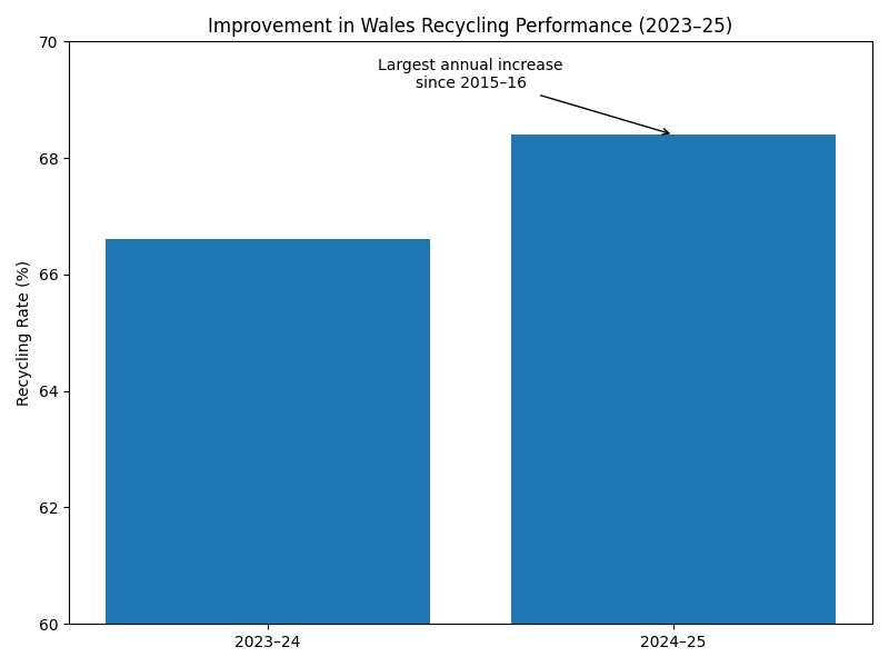 The 2024–25 increase represents the largest annual improvement in Wales’s recycling rate since 2015–16.