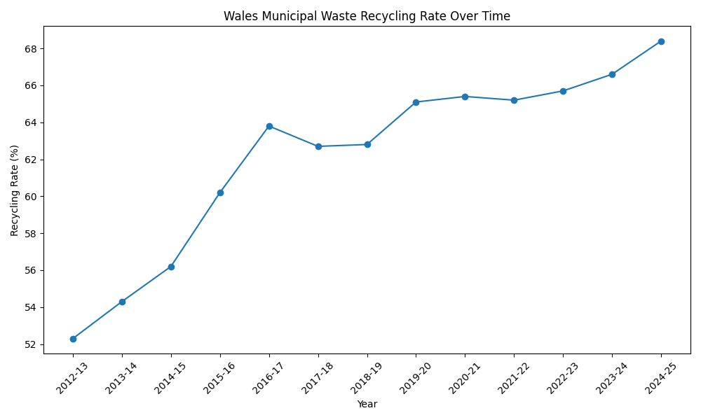 Source: StatsWales municipal waste management statistics and Welsh Government recycling performance data (2012–13 to 2024–25)